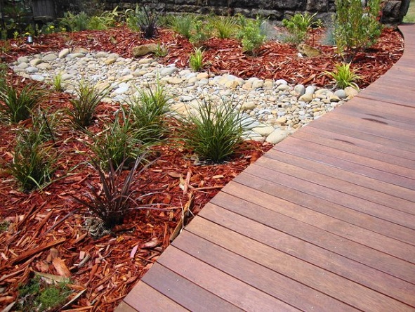 Garden Crew landscaped the front garden by constructing a boardwalk out of Merbau.  The boardwalk meanders around a dry river bed. Predominately native plants flank the dry river bed to create an atmosphere of being in the Australian bush.
