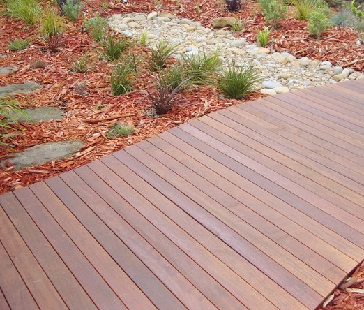 Garden Crew landscaped the front garden by constructing a boardwalk out of Merbau.  The boardwalk meanders around a dry river bed. Predominately native plants flank the dry river bed to create an atmosphere of being in the Australian bush.